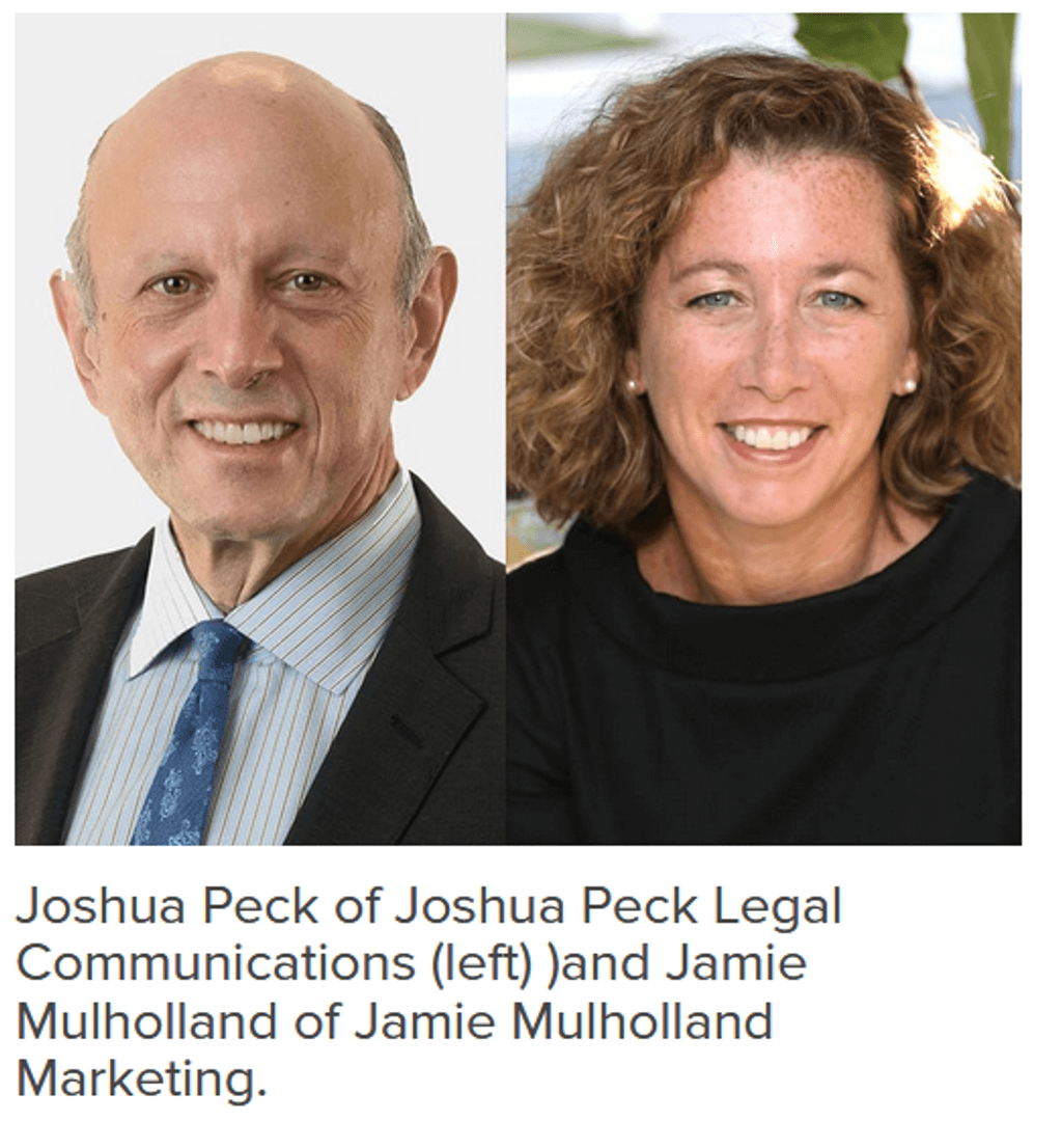 Joshua Peck of Joshua Peck Legal Communications is a former journalist and internationally known media relations pro for law firms; he founded the industry group “Law Firm Media Professionals,” and has spoken widely on legal P.R and Crisis Management.